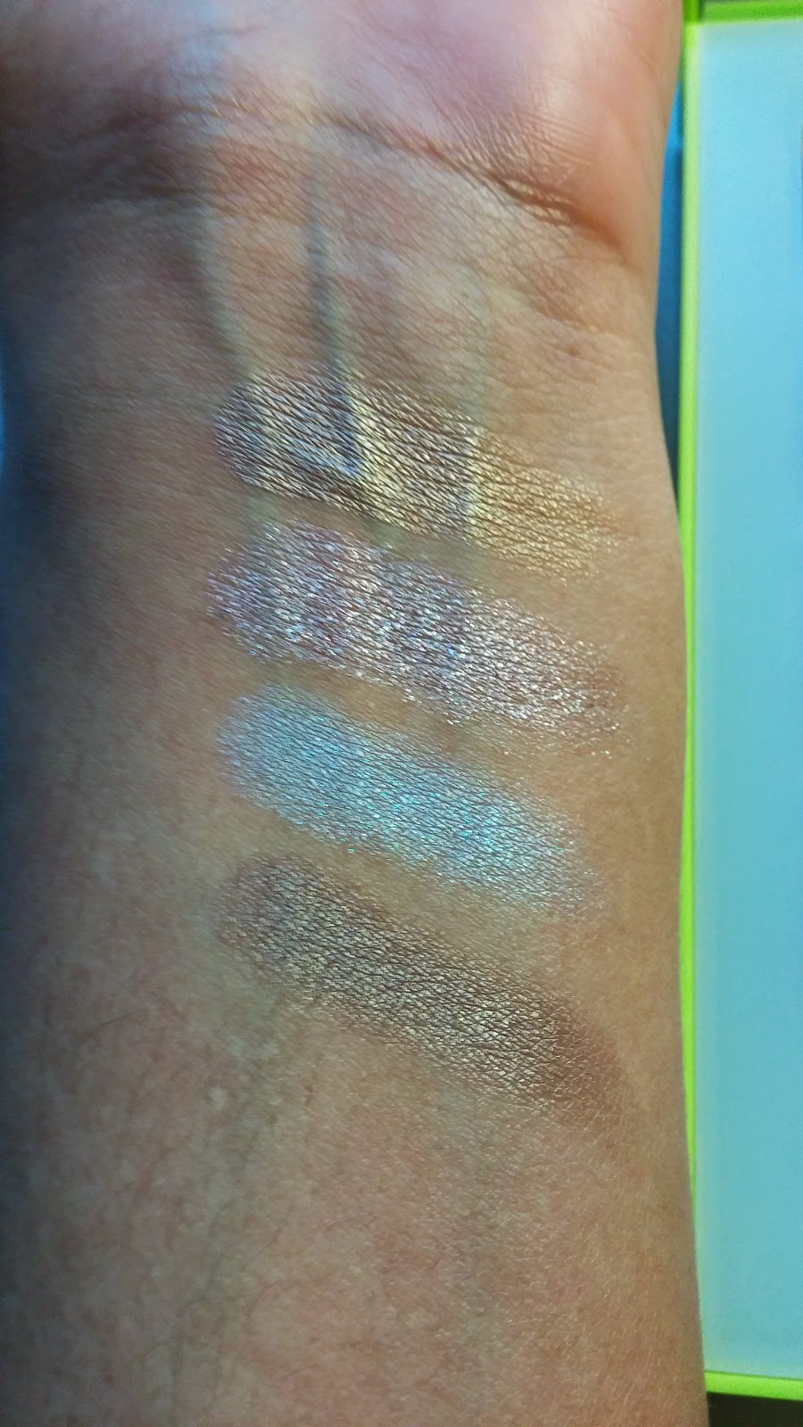 All shadows were swatched on my NC42 skin, without a primer. It's a rare cloudy day in Souther California, so a did have a light on but they are showing up true to color. I will name and describe shadows top to bottom.